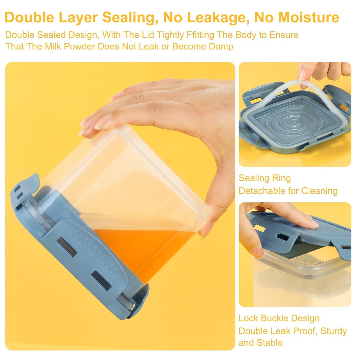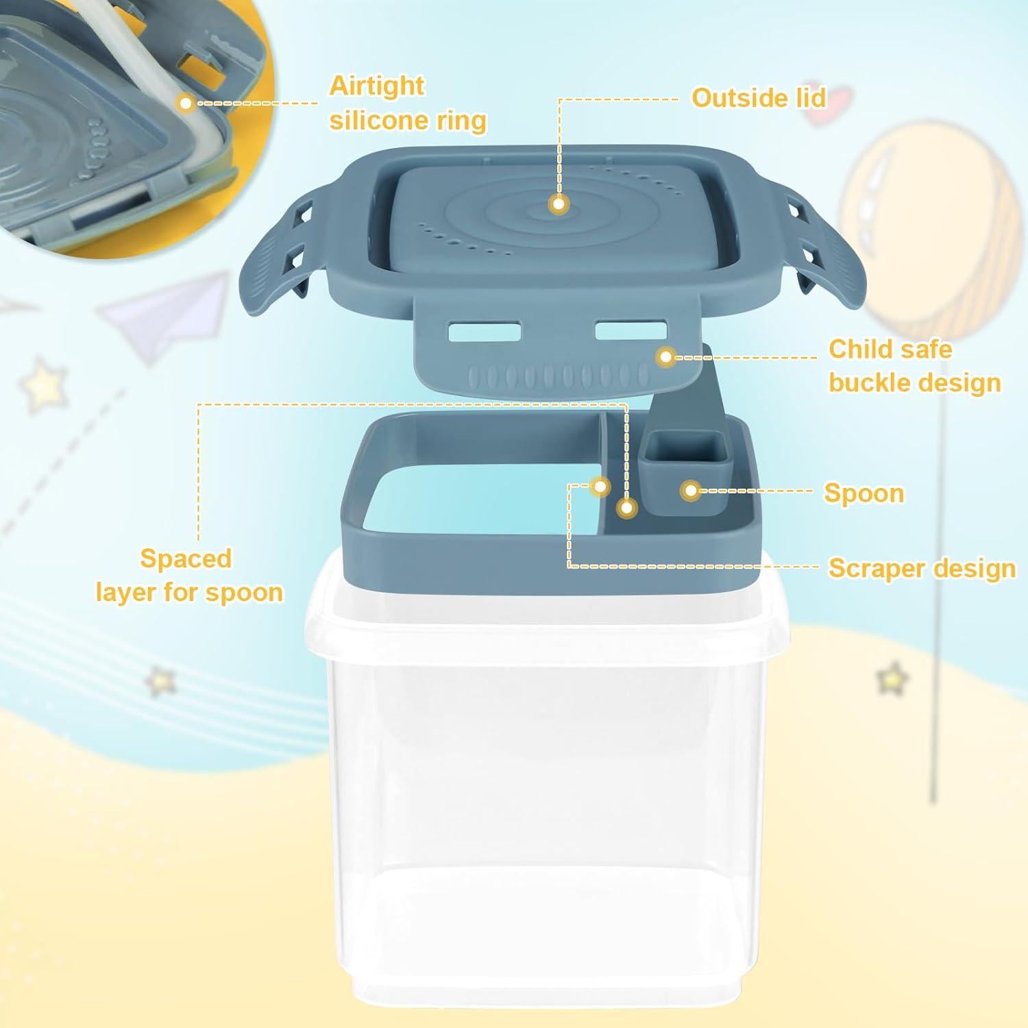 Clever Design:Scoop Leveller Design – Help you scoop each spoon of milk powder accurately and easily. Ensure the quantity of milk powder, refusing waste; Carefully Designed Spoon Placement-For easy isolation from the milk powder; The top of the cover has a Snap Groove Design that allows for stacking of each milk powder container, saving space.