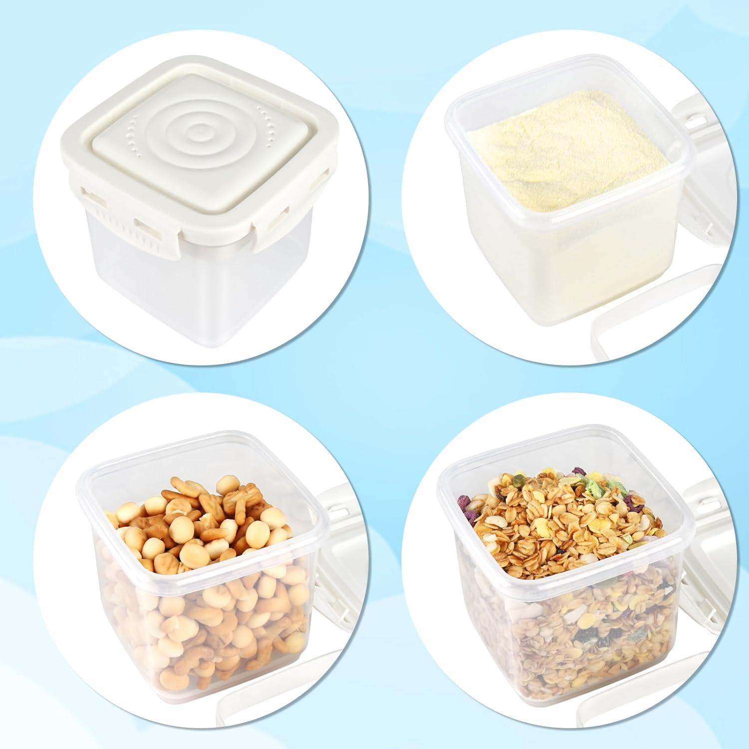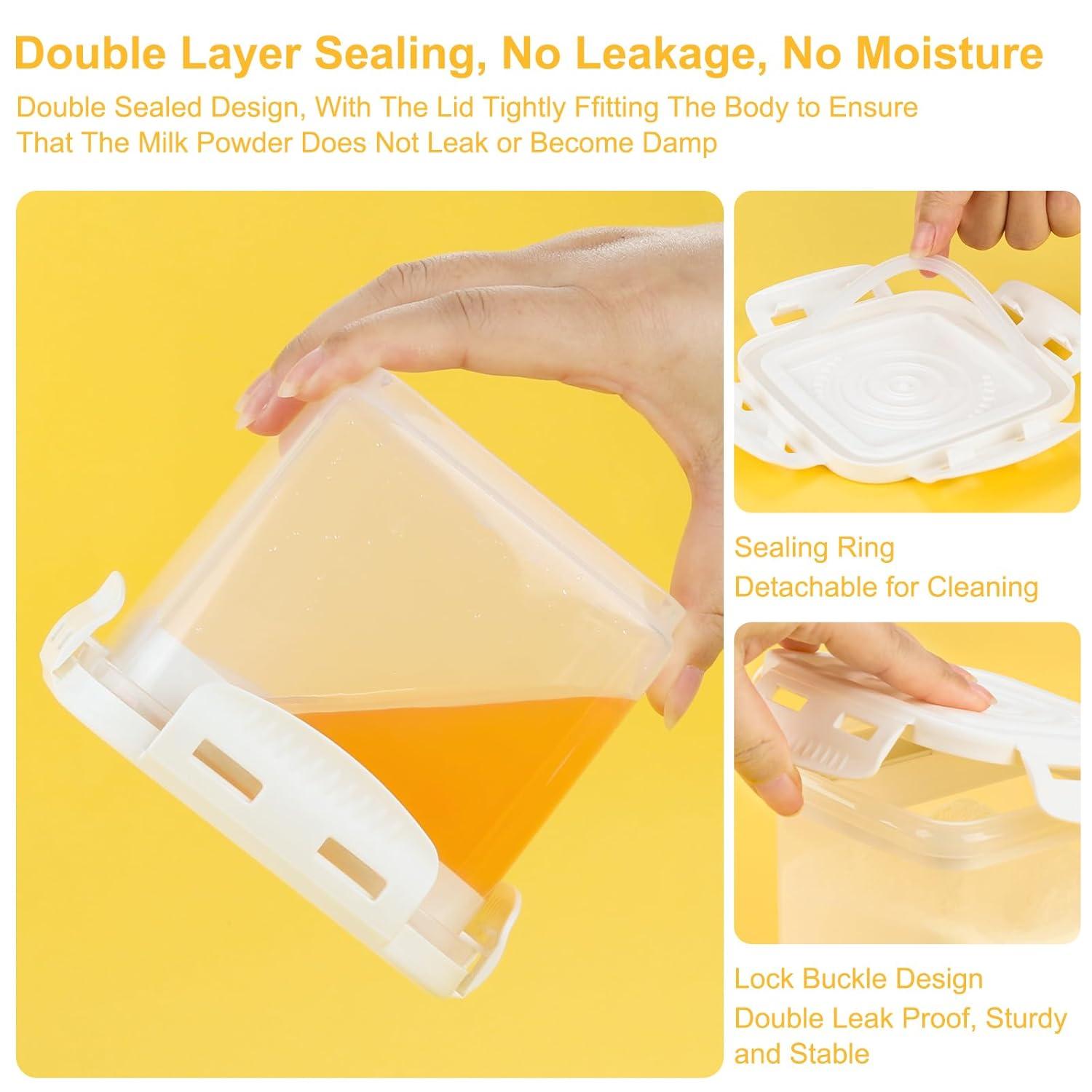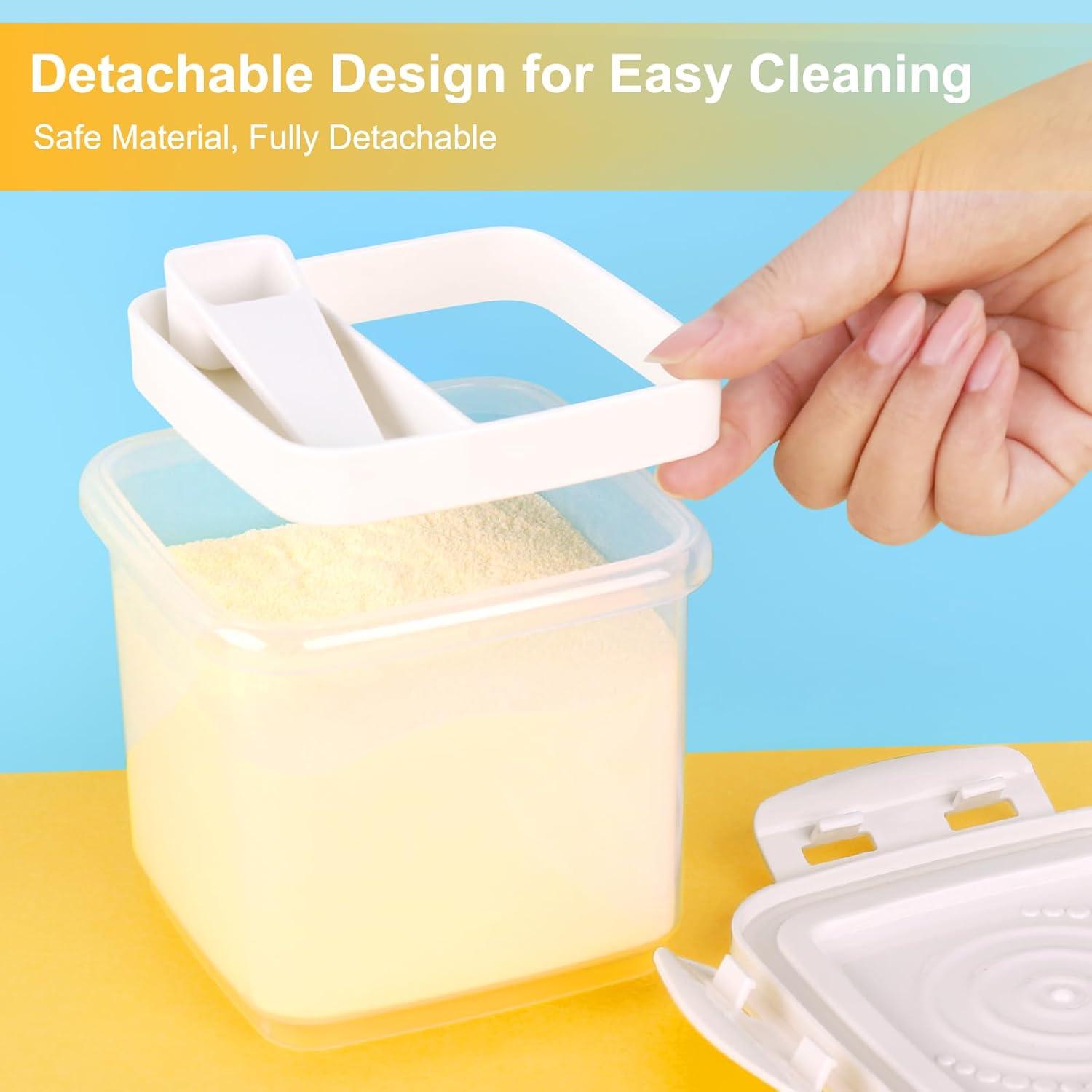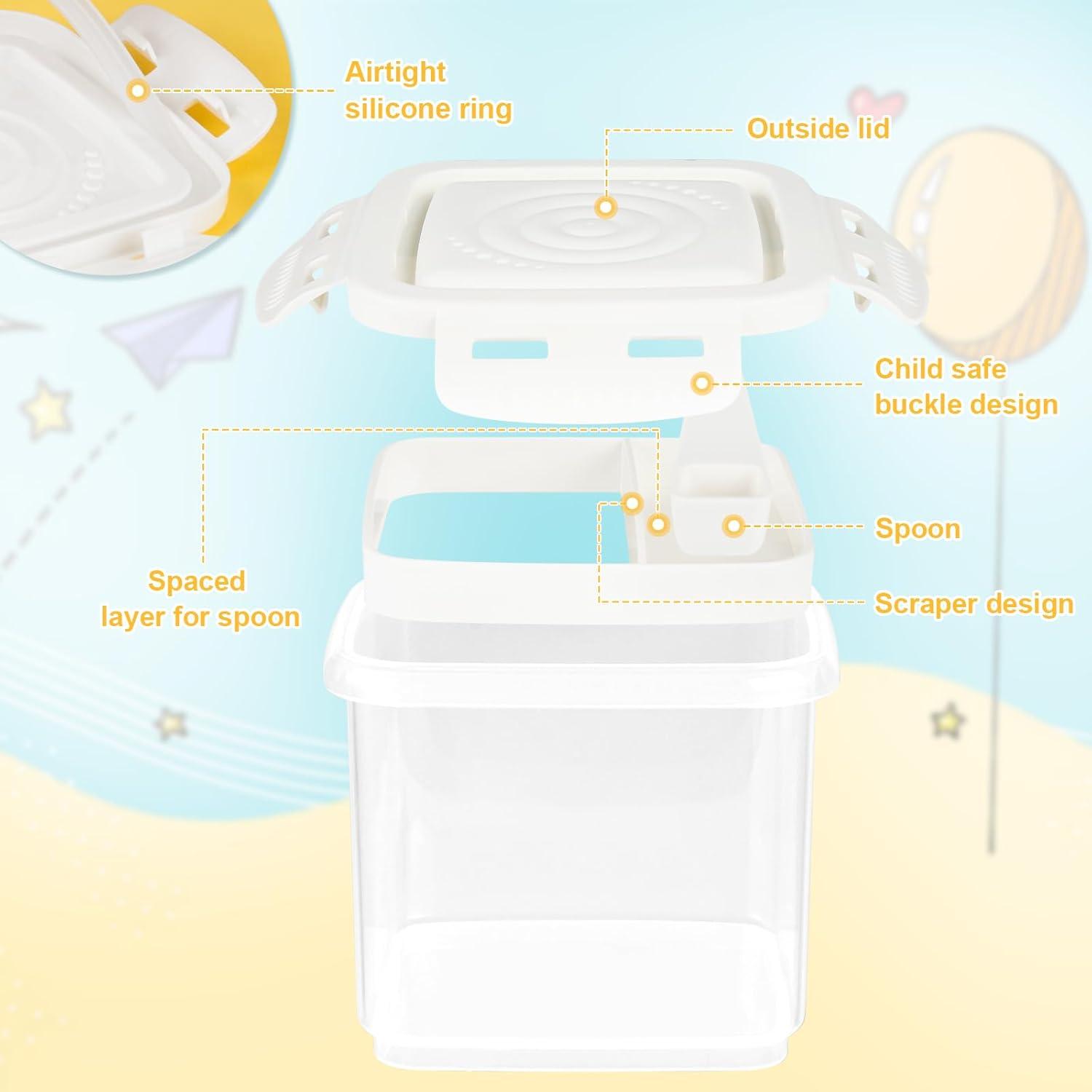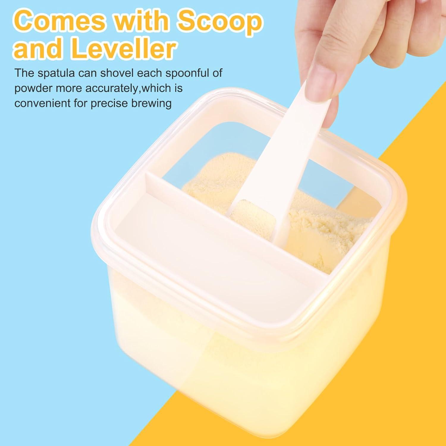 Clever Design:Scoop Leveller Design – Help you scoop each spoon of milk powder accurately and easily. Ensure the quantity of milk powder, refusing waste; Carefully Designed Spoon Placement-For easy isolation from the milk powder; The top of the cover has a Snap Groove Design that allows for stacking of each milk powder container, saving space.