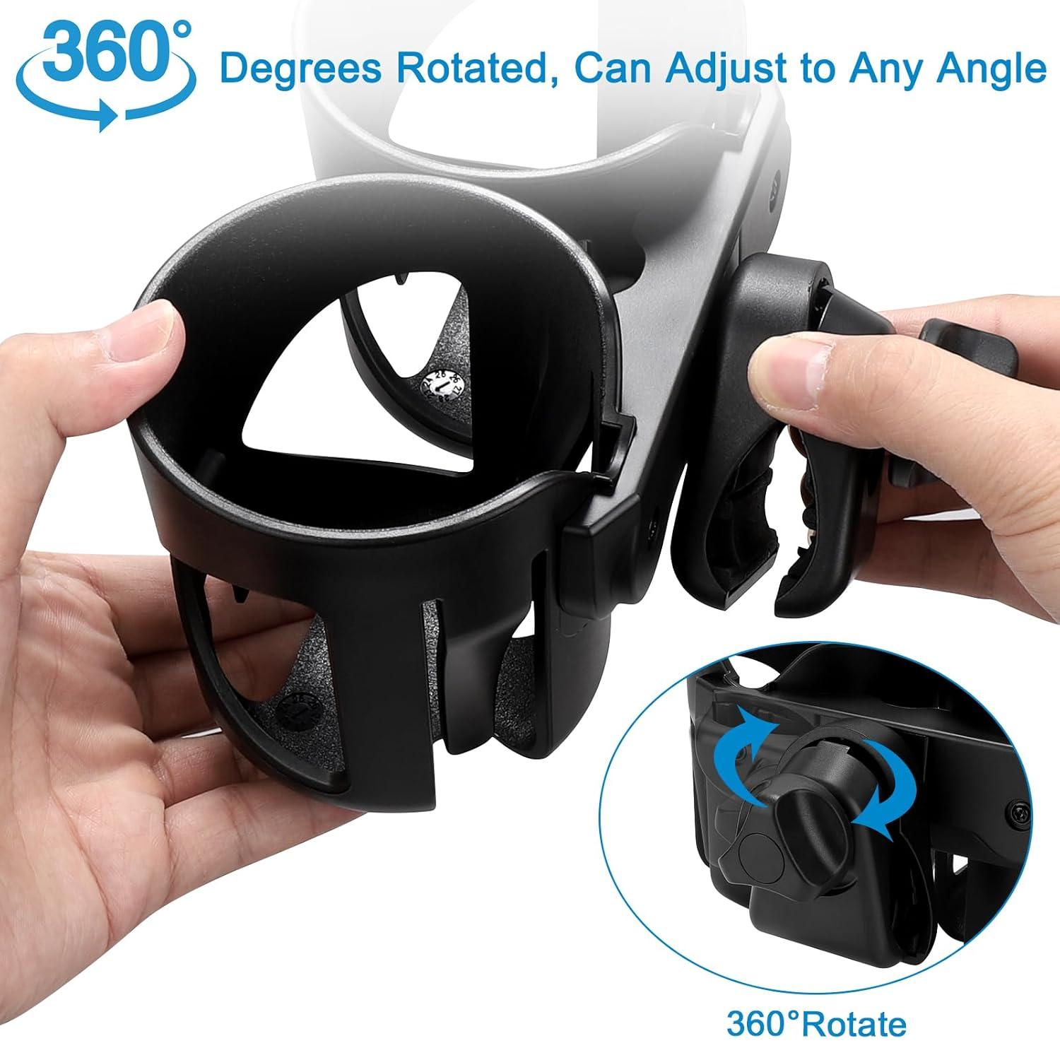 Multifunctional cup holder could be used for stroller, wheelchair, walker, bike, scooter, armrest, trolleys, pushchair, lawnmowers, ATV, treadmill, golf cart, shopping cart, kayak, boat handlebar, motorcycle, beach chair etc.