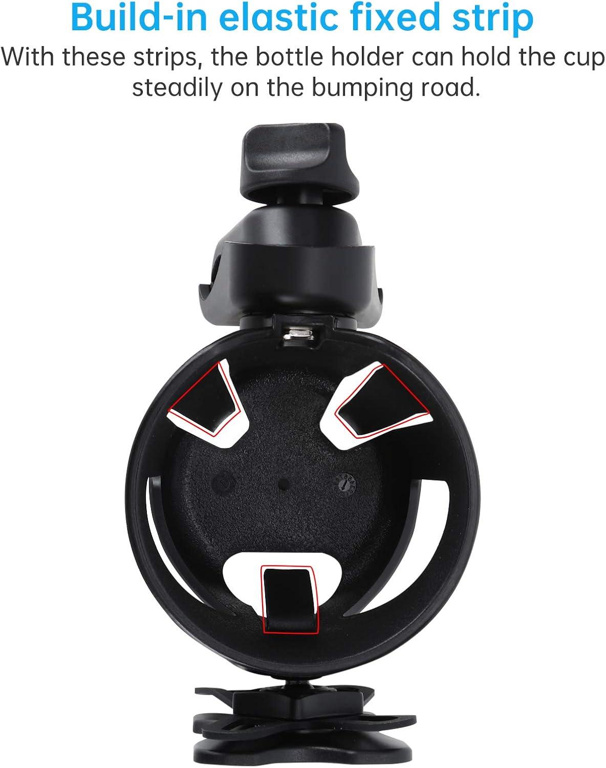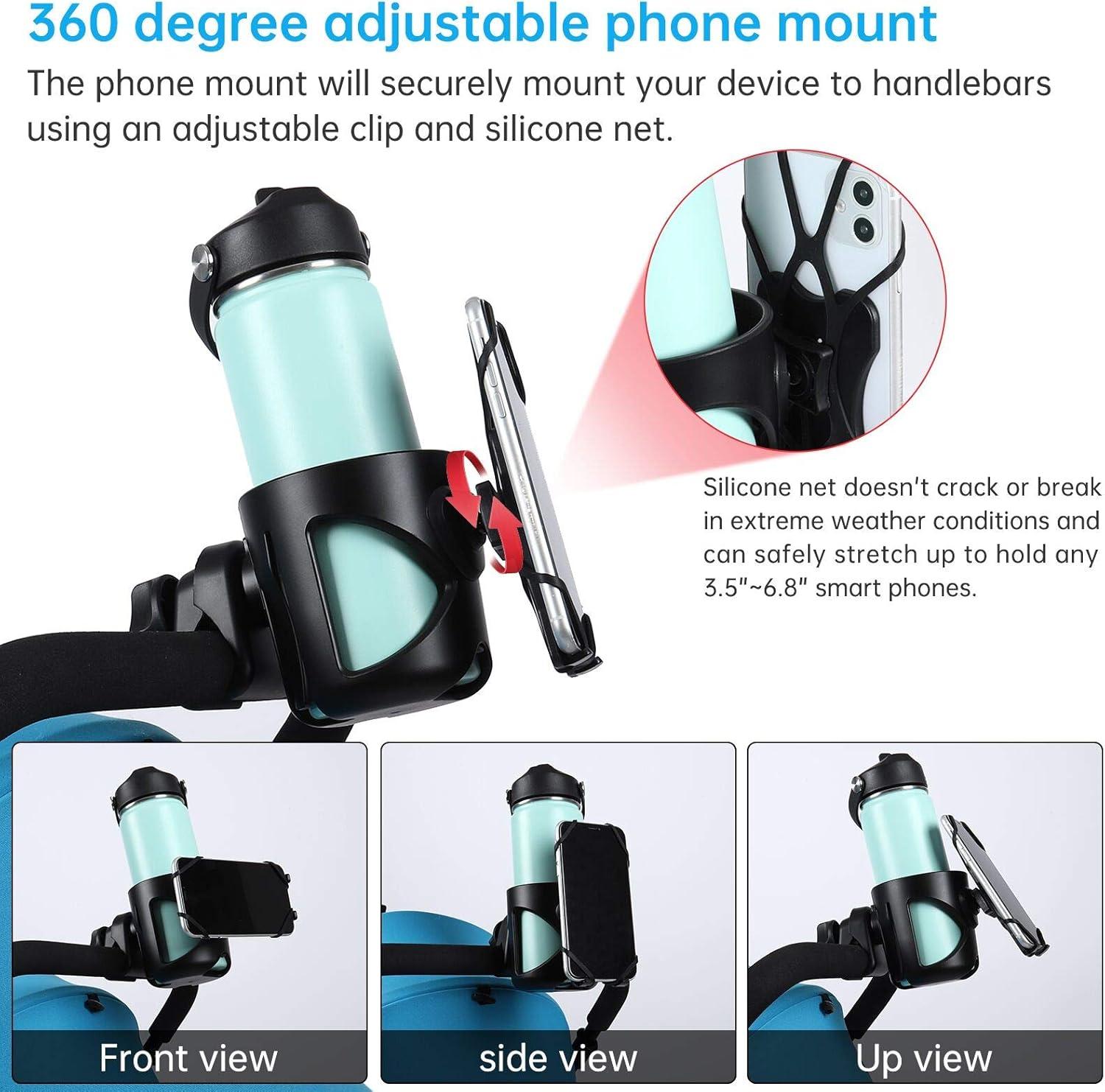 The cup holder is made with 360 degree adjustable phone mount, it can load drink bottles and mobile phones at the same time. The phone mount will securely mount your device to handlebars using an adjustable clip and silicone net. Silicone net doesn't crack or break in extreme weather conditions and can safely stretch up to hold any 3.5″*6.8″ smart phones. Tips: The elastic rope of the phone holder can be adjusted !