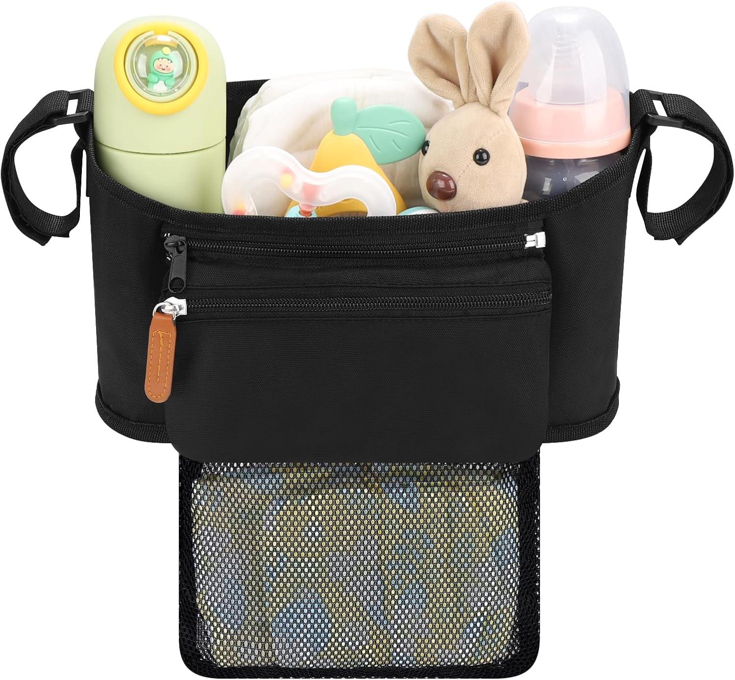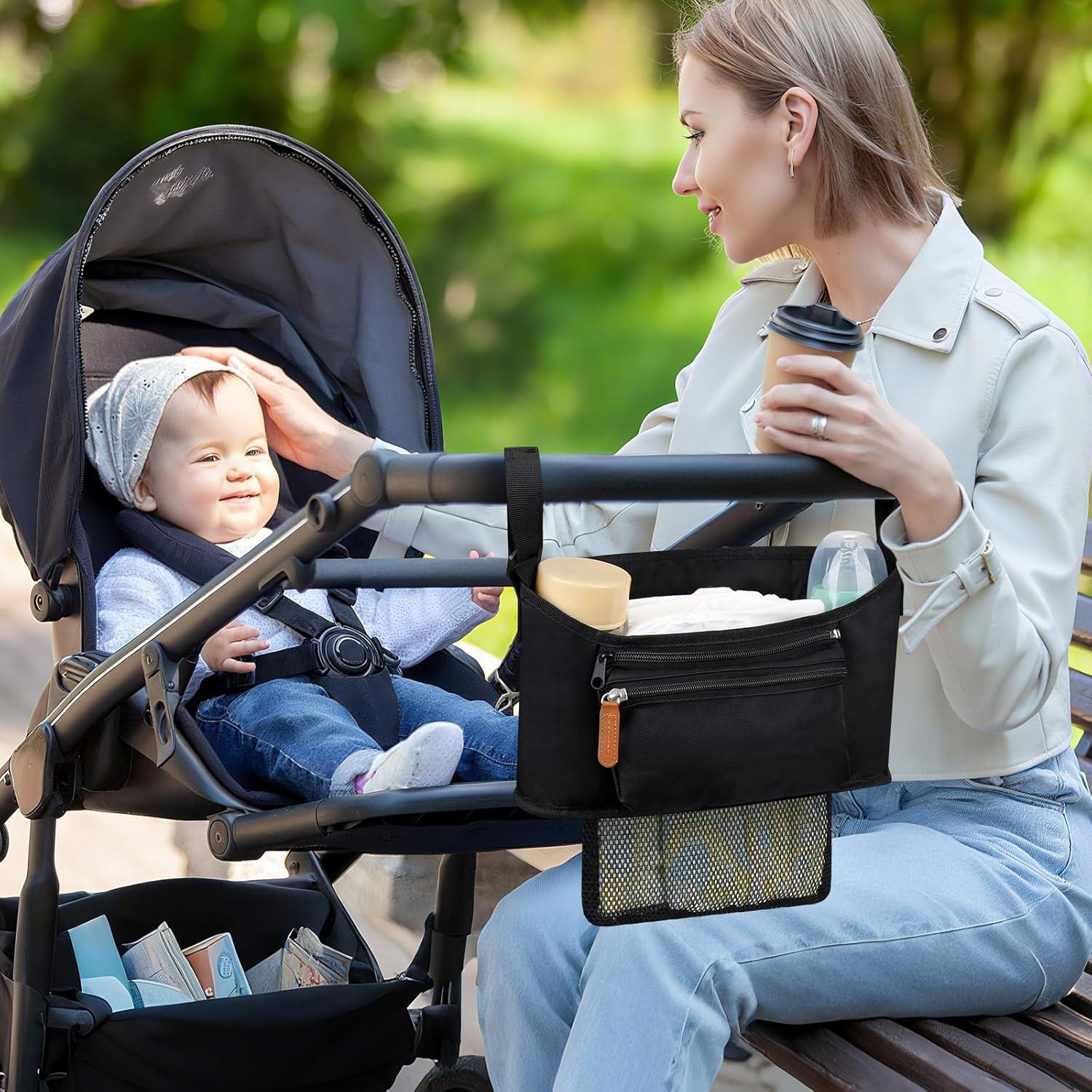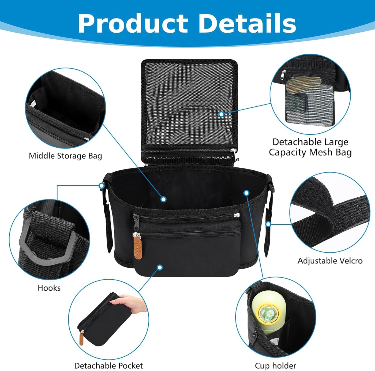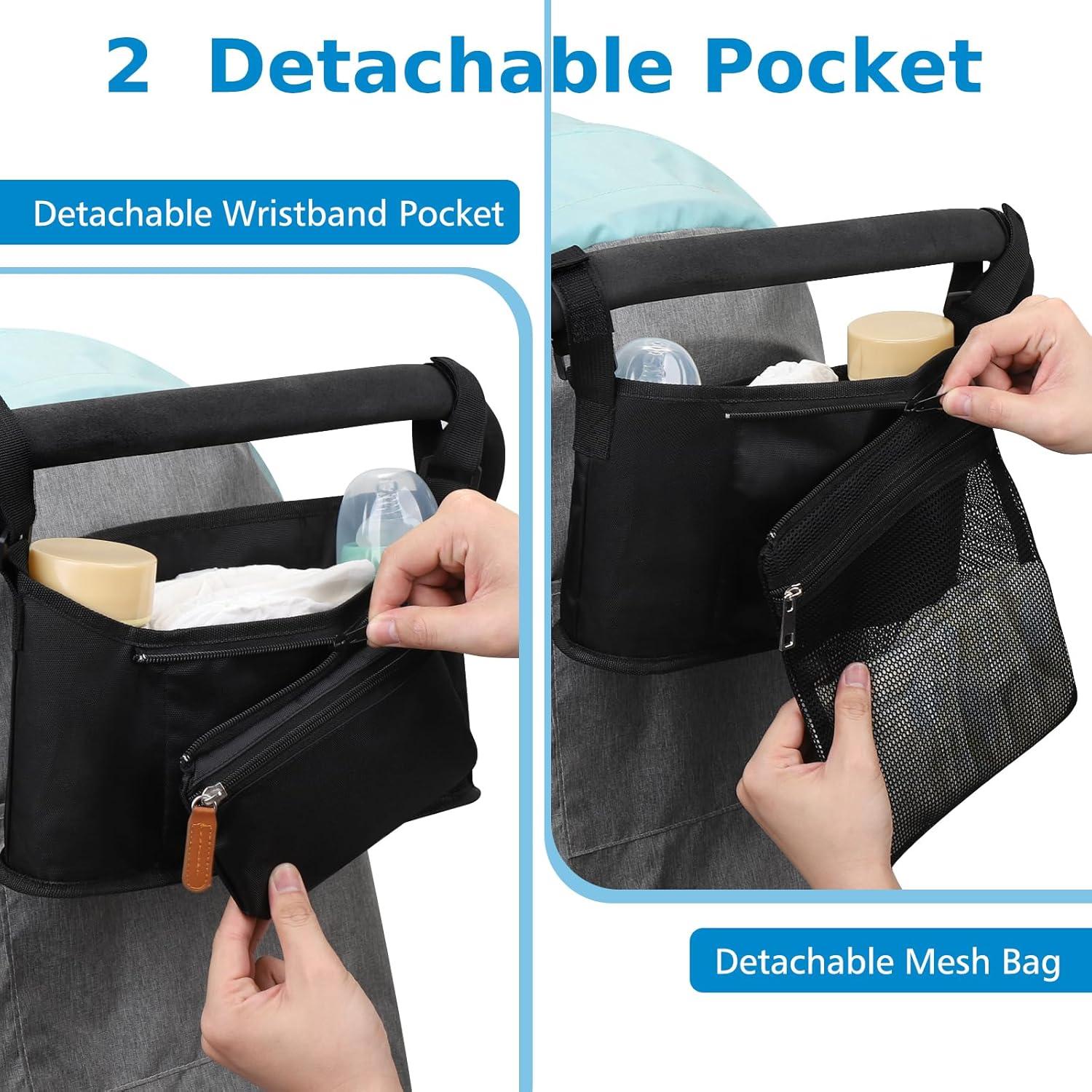 Large Capacity: The middle large storage compartment can storage baby diapers, toys, clothes, pacifiers or other accessories; 2 cup holders on two sides, can be used to place baby bottles, beverage cups, water bottles etc; Zipper pocket can hold important items such as cell phone; Detachable mesh diaper bag on the back for storage baby diapers or other essentials.