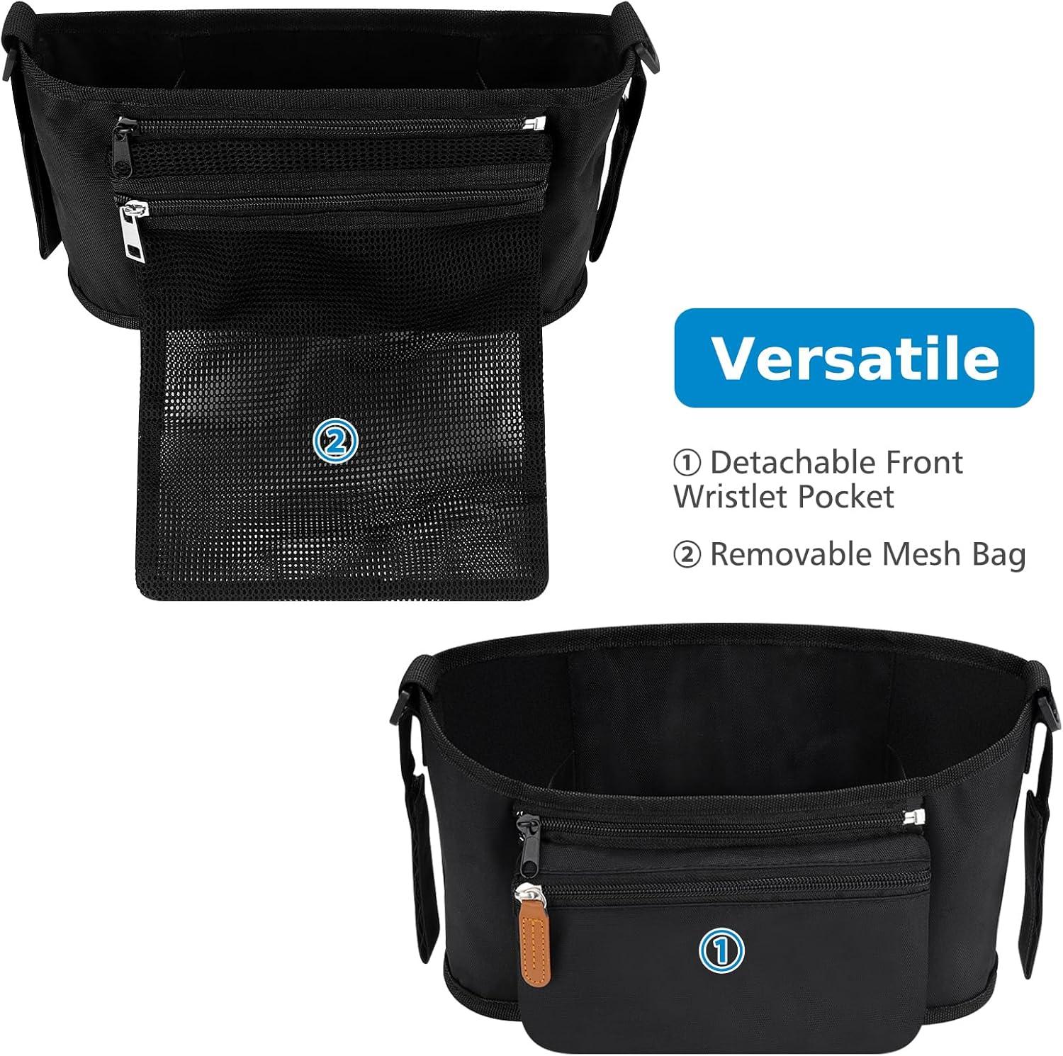 Detachable Wristband Pocket & Mesh Bag: The front zipper pocket and the back diaper mesh pocket of this stroller bag can be freely disassembled and used separately.